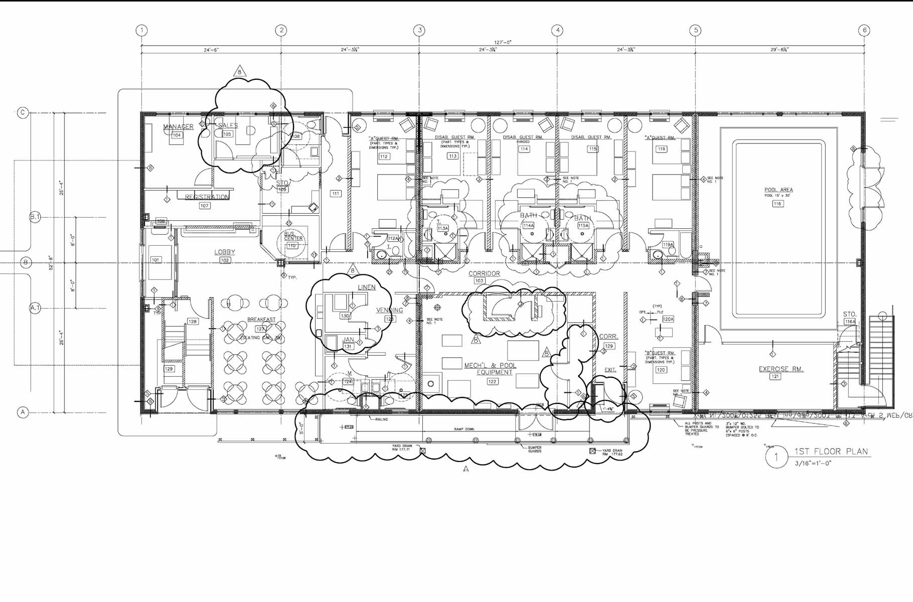 Two floor wood framed hotel, 25 rooms, with pool and lounge